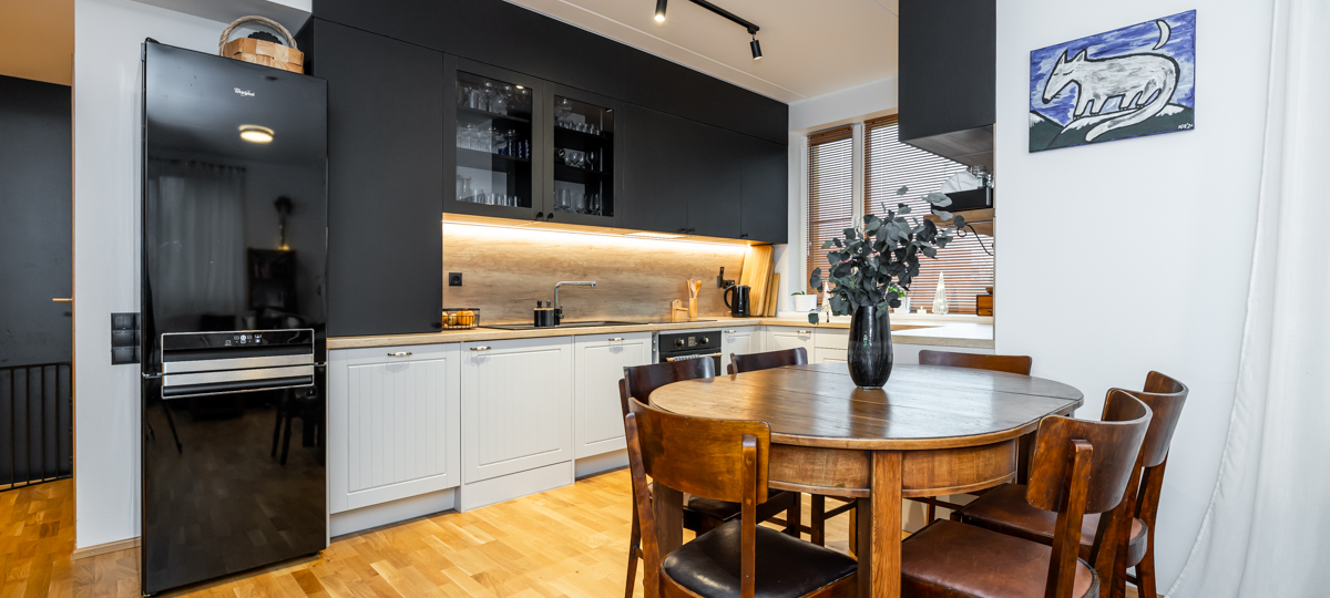 furnished kitchen, strip flooring, refrigerator, open kitchen, shower, ventilation, washing machine