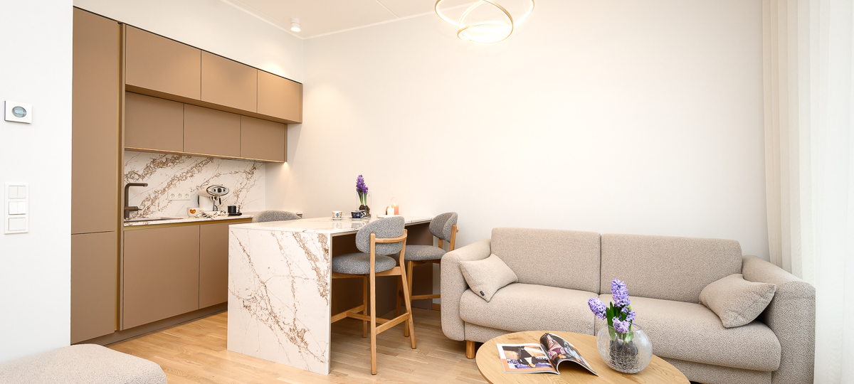 Korter paistab silma oma kõrgetasemelise sisustuse ja läbimõeldud disainilahendustega. Disaineri loodud interjöör loob mõnusa harmoonia, kus maitsekad värvitoonid sulanduvad ideaalselt Pärnu rannalinna miljöösse – liivakarva pastelsed toonid ning rannakive imiteerivad köögipinnad loovad rahuliku ja elegantse atmosfääri.