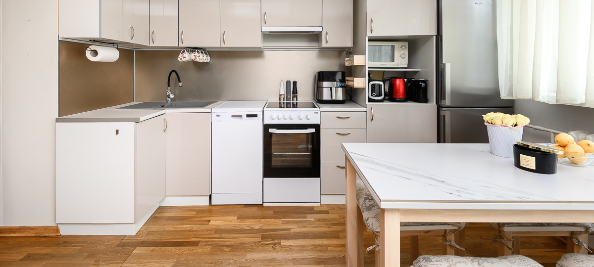 avatud köök, dušš, pesumasin, külmkapp, köögimööbel