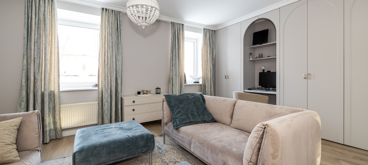 Korter on sisustatud kallite sisseehitatud kappide(eritellimus) ning luksusliku mööbli, valgustite ja aknakatetega.