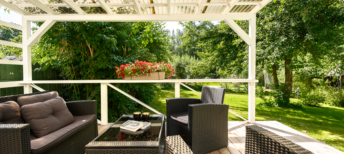 Suur varikatusega lõuna- ja õhtupäikese poole avanev terrass võimaldab eluruumi suvekuudel laiendada.