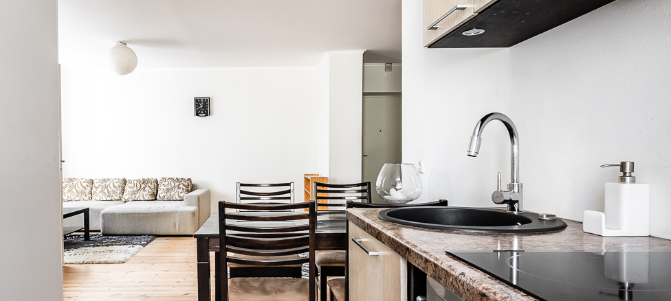 külmkapp, köögimööbel, avatud köök, pesumasin, dušš